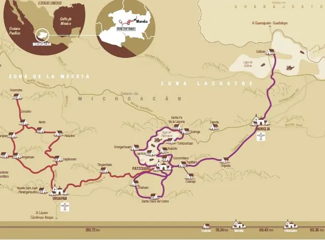Morelia, the current capital of Michoacán, Pátzcuaro, the capital of Don Vasco de Quiroga, and Uruapan are the backbone of the route that covers more than 120 towns, including four of the eight magical towns of the state: Pátzcuaro, Tzintzuntzan, Santa Clara del Cobre and Cuitzeo. The Don Vasco Route offers visitors unforgettable experiences for an optimal vacation full of extraordinary experiences.