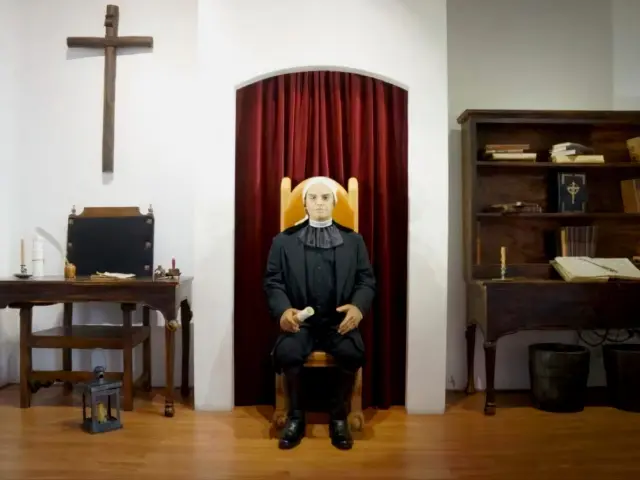 The animatronic tells the story of the Servant of the Nation out loud, wearing the traditional bandana with which we identify Morelos and dressed in black, a bit like a muleteer, a bit like a priest.