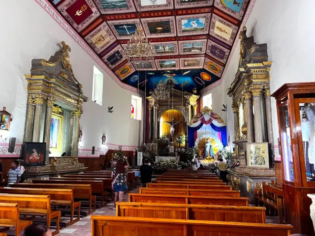 The coffered ceiling of the church displays bright colors and simple figures alluding to passages from religious stories, as if they were addressed to simple and childlike minds, perhaps thought of through the eyes of the Puréchepas.