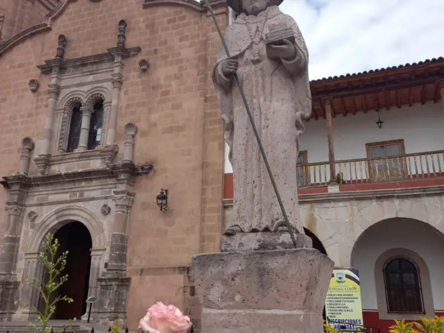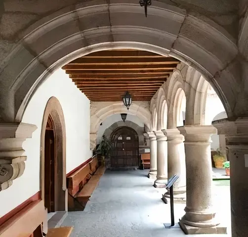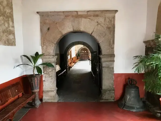 It has three semicircular arches supported by pillars. At the top there is a corridor, a loggia, with wooden pillars supporting a roof of beams with tiles. In front there is a sculpture of Brother Jacobo Daciano. Right here there is a sundial from 1858.