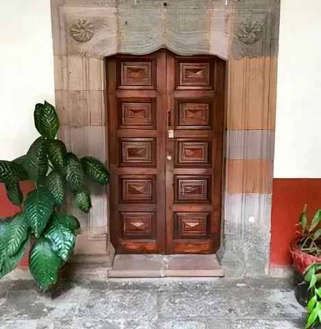 The doorway has two bodies. The style is Renaissance Plateresque. The first is a semicircular arch framed by two columns with Corinthian capitals. Then there are other capitals that are integrated into a cornice where there are two small columns that end in shells. On the sides of the arch there are also two shells. A common element in the doorways of Michoacan churches of the 17th century.
