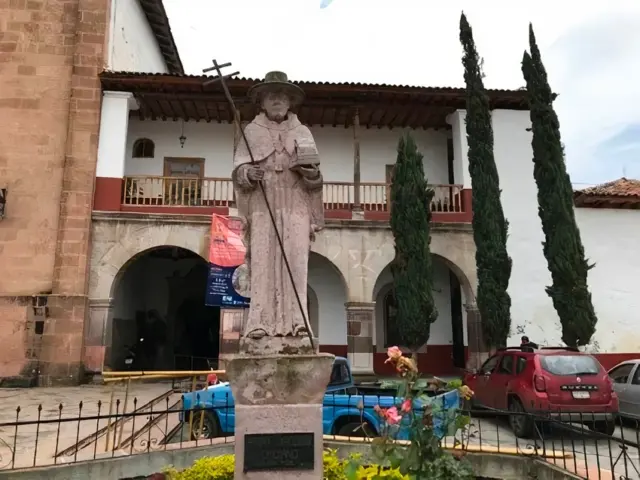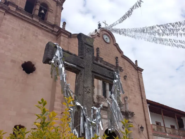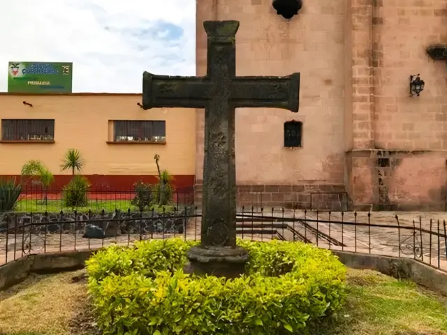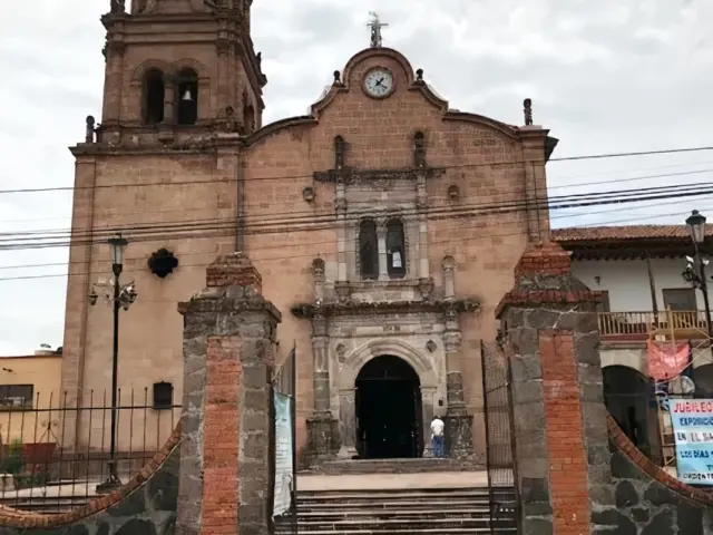 The church and convent were built around 1548. The first construction was directed by Friar Jacobo Daciano. Workers from Querécuaro, in the Cherán mountains, were involved. Later, a second church and convent was built by Friar Pedro de Pila on the foundations of the first. This work was made of masonry. It is the convent that Ponce saw in 1586. At that time the convent was finished, but the church was under construction (G. Kubler). Daciano also participated in the reconstruction, around the same time, of the complex of Tzintzuntzan.