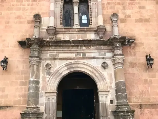 It is from the 17th century. It is carved in stone and some of the original elements can still be seen. It is very beautiful. It is in the atrium to the left of the church.