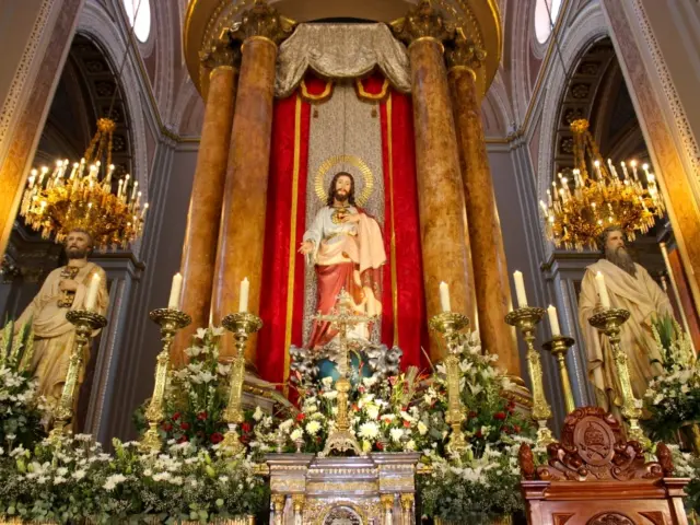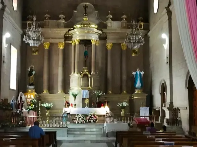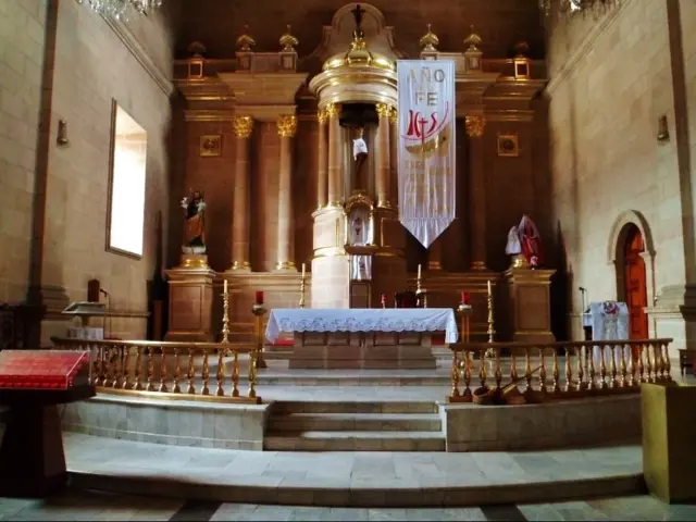 The main altar has a body, three columns and a top. In the centre there is a cypress tree with four columns with Corinthian capitals. Inside there is a Christ from the colonial period. On the side columns there are two columns with Corinthian capitals.