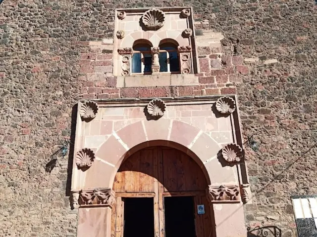 En la parte superior también un alfiz con una ventana biforada con dos arcos de medio punto. Una concha de adorno en la parte superior. La torre es de planta cuadrangular con dos cuerpos y el remate un techo con tejas.