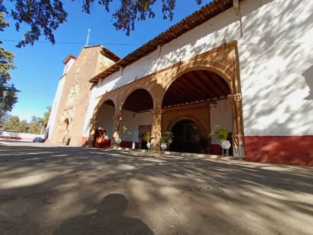 En el siglo XVI hubo una cruz atrial de piedra, pero se encontraba en muy mal estado y en 1942 se sustituye por la de fierro, que ahora se ve. Se dice que el diseño es del surrealista André Bretón que vivió algún tiempo en esta comunidad cuando estuvo en México.