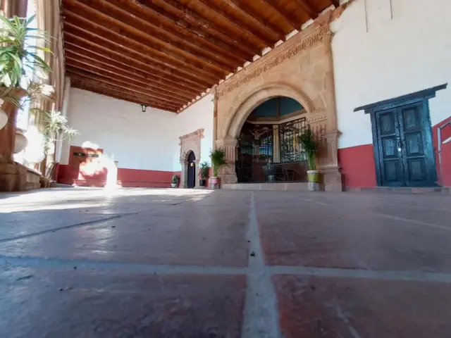 El portal se compone de tres arcos de medio punto que se asientan en columnas que se conocen como tritóstilas, que son las que acentúan el volumen del primer tercio del fuste, como se ve aquí. El estilo puede calificarse como renacentista. El techo es de vigas de madera.