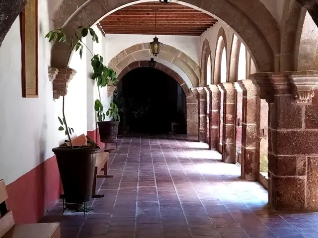 El patio del convento es cuadrado, se divide en cuatro tramos y tiene plantas. En el centro un pozo de agua. El claustro bajo tiene cuatro arcos de medio punto dobles en cada uno de sus lados. Se sostienen en columnas de cantera. En el claustro alto hay también cuatro arcos de medio punto en cada lado, que se asientan en columnas de cantera. Los techos de los claustros son de vigas de madera. En la parte posterior del convento se ubica un huerto. Hay una salida desde el convento que ofrece una vista directa al lago.