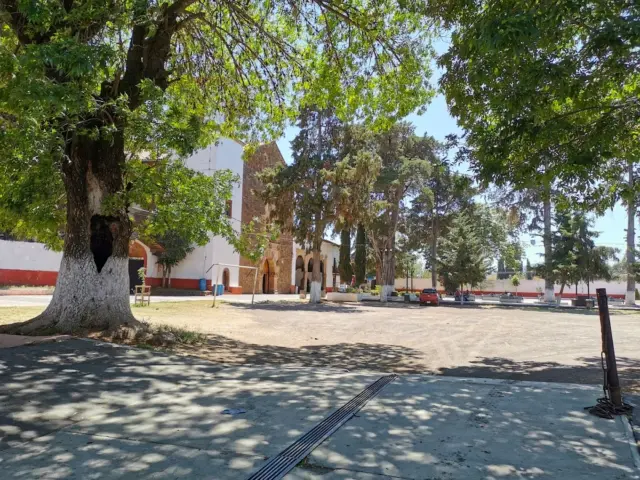 El atrio conserva la traza original y está bardeado. Hoy tiene árboles y bancas, funciona como una plaza al servicio de la comunidad. Es de dimensiones amplias.