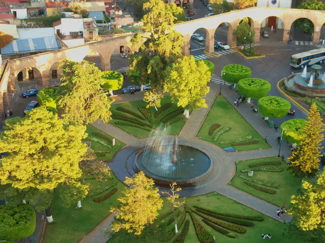 Porque es el punto final perfecto para tu caminata por Morelia. Después de recorrer la ciudad, llegar aquí es un respiro visual donde la cantera rosa da paso al verde de los jardines. Desde este punto puedes admirar la Fuente de las Tarascas y ver cómo los arcos del Acueducto se extienden infinitamente. Es el sitio ideal para sentarse, descansar los pies y prepararse para el regreso a Pátzcuaro.
