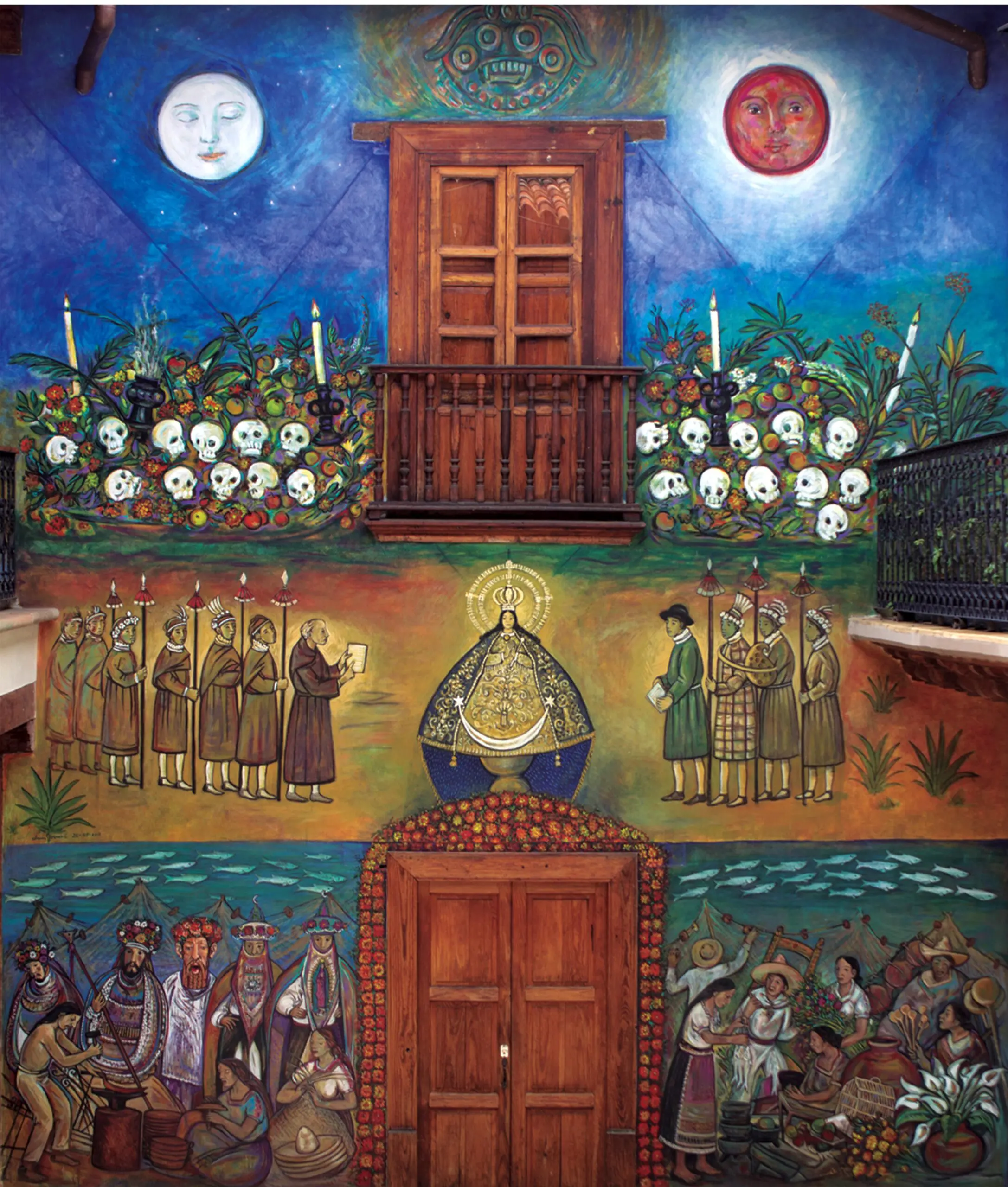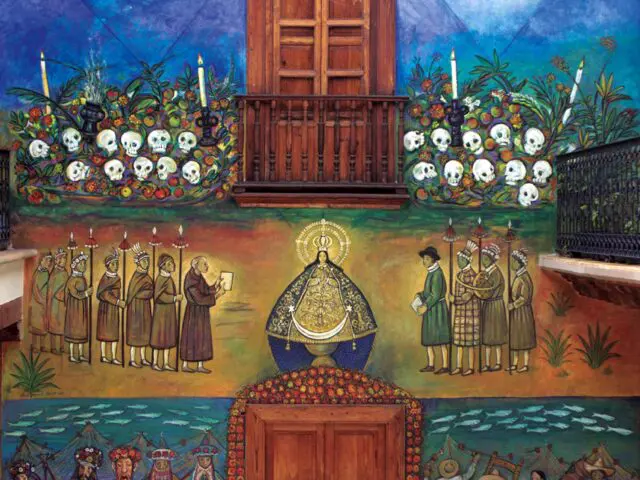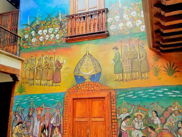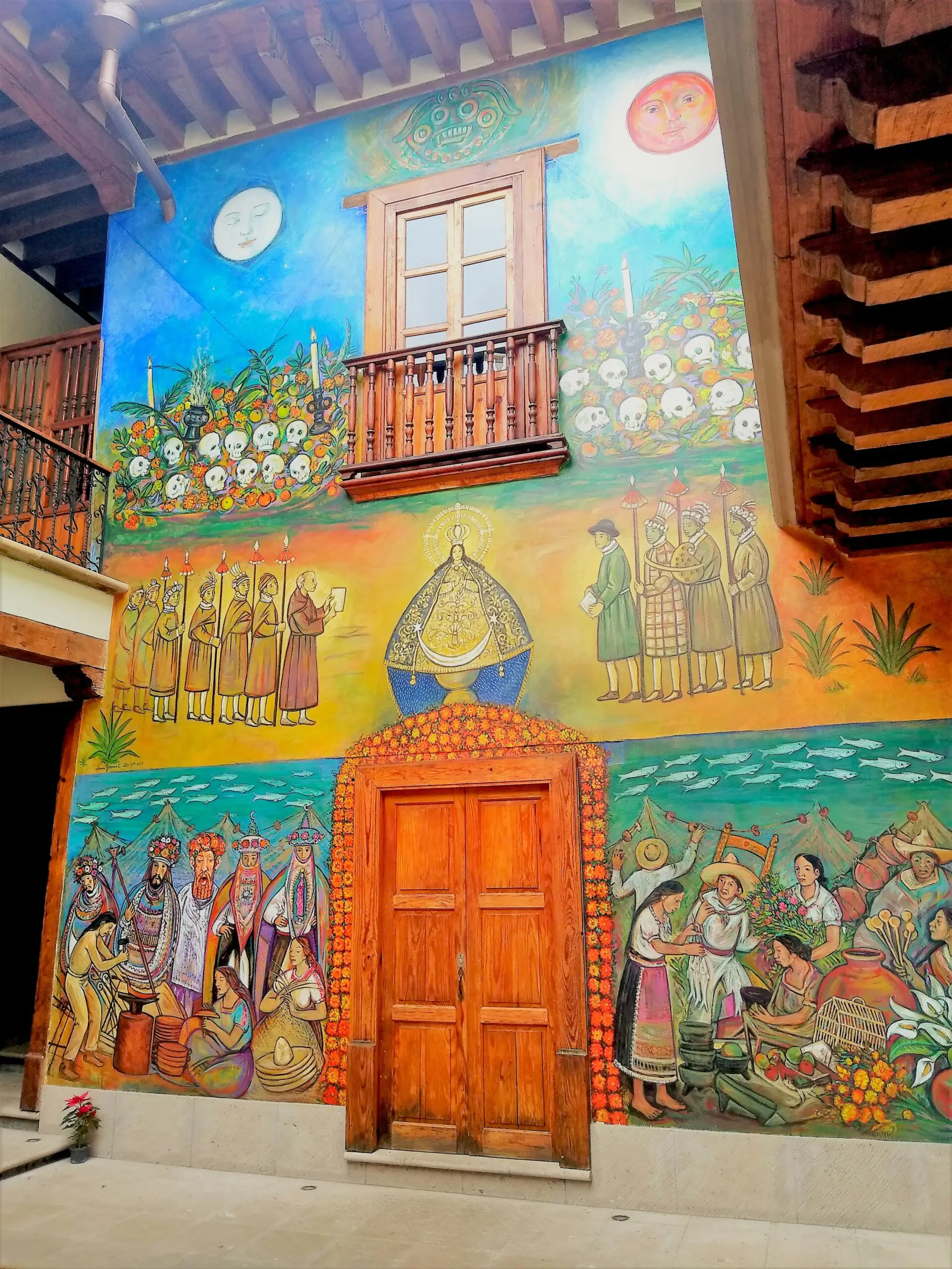 La Experiencia: Este mural es vibrante y moderno. Es como si el maestro Torres nos hubiera puesto un espejo para decirnos: “Mírense, qué hermosos somos”. Aquí la historia no se siente lejana. Verás la Noche de Muertos con sus velas, la algarabía de las fiestas y la serenidad de los pescadores. Nos recuerda que la historia de Pátzcuaro no terminó en la colonia; se sigue escribiendo todos los días.