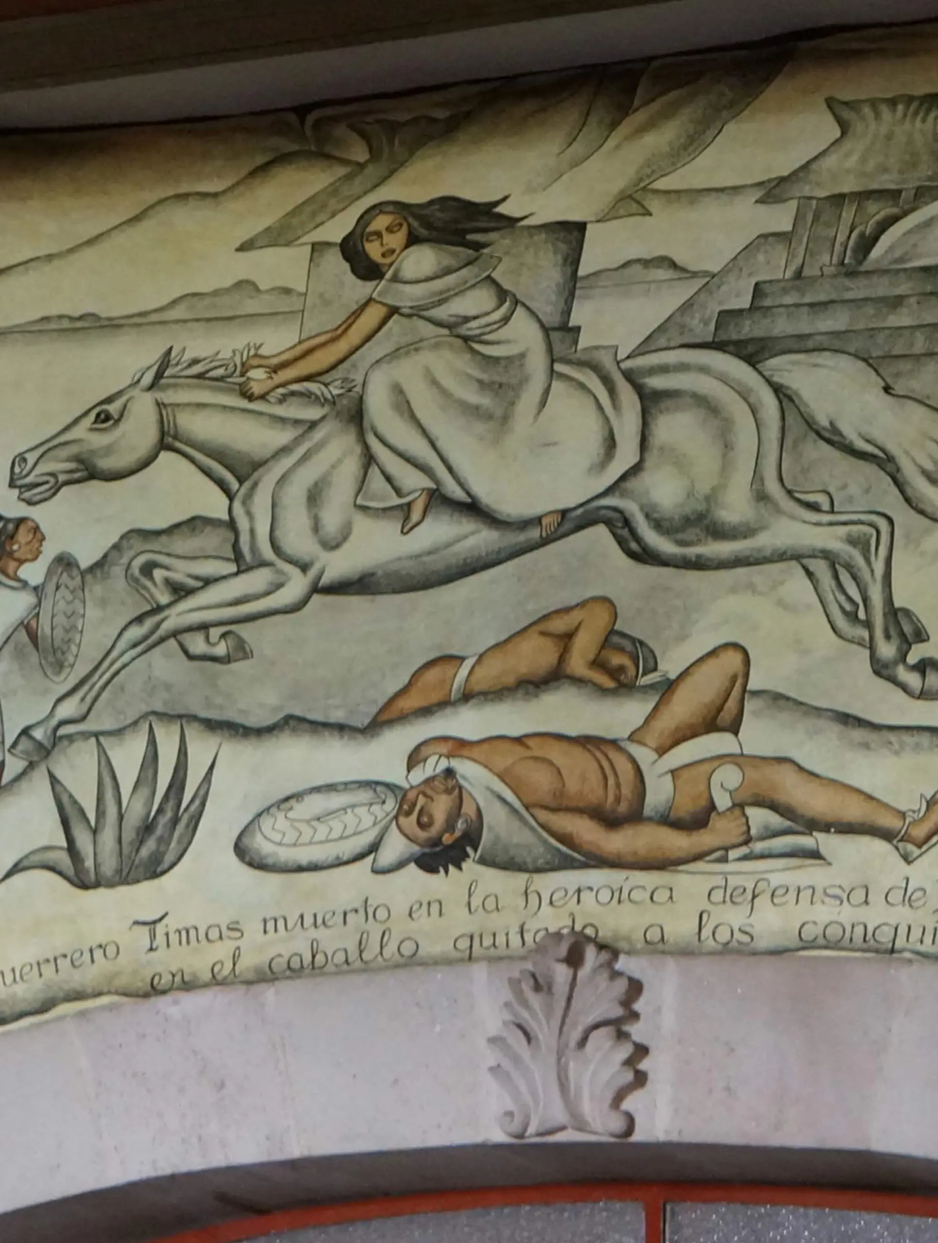 La Eréndira a Caballo: A diferencia de otras representaciones, aquí la heroína purépecha aparece triunfante, un símbolo que Cárdenas adoptó personalmente (de ahí el nombre de la quinta).