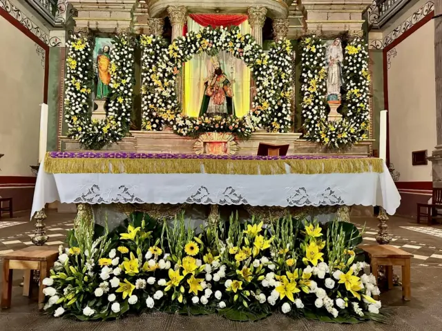 En el presbiterio vemos un altar neoclásico de tres calles: las dos laterales flanqueadas por columnas estriadas de capitel compuesto, al centro está el ciprés de planta elíptica enmarcado por cuatro columnas. El entablamento se adosa al muro en los extremos adornándose con ánforas; al centro se desplaza para crear la cúpula elíptica bulbiforme coronada con un elemento moldurado semicircular que enmarca la cruz al centro con dos ánforas de perillón a los lados. Está pintado simulando mármol a la manera de los altares de influencia clásica europea.